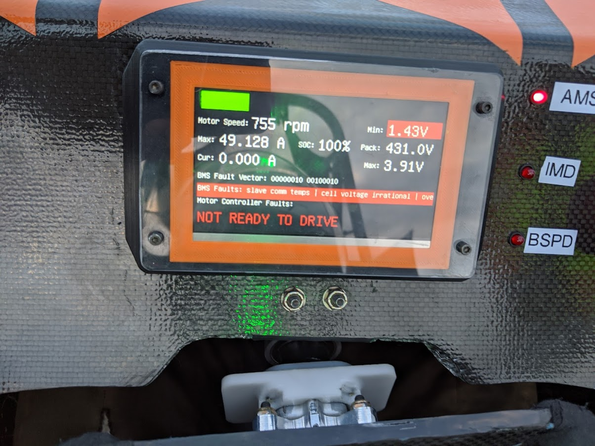 The required items to be displayed are fault and safety related. On MD25, the dashboard was composed of multiple LEDs wired separately. This caused issues with wiring and integration with just a mess of wires hidden in the dashboard. A integrated dashboard will make it way easier to wire everything and allow more features to be implemented in a single system. By modularising this, it makes it significantly easier to maintain and debug the system.